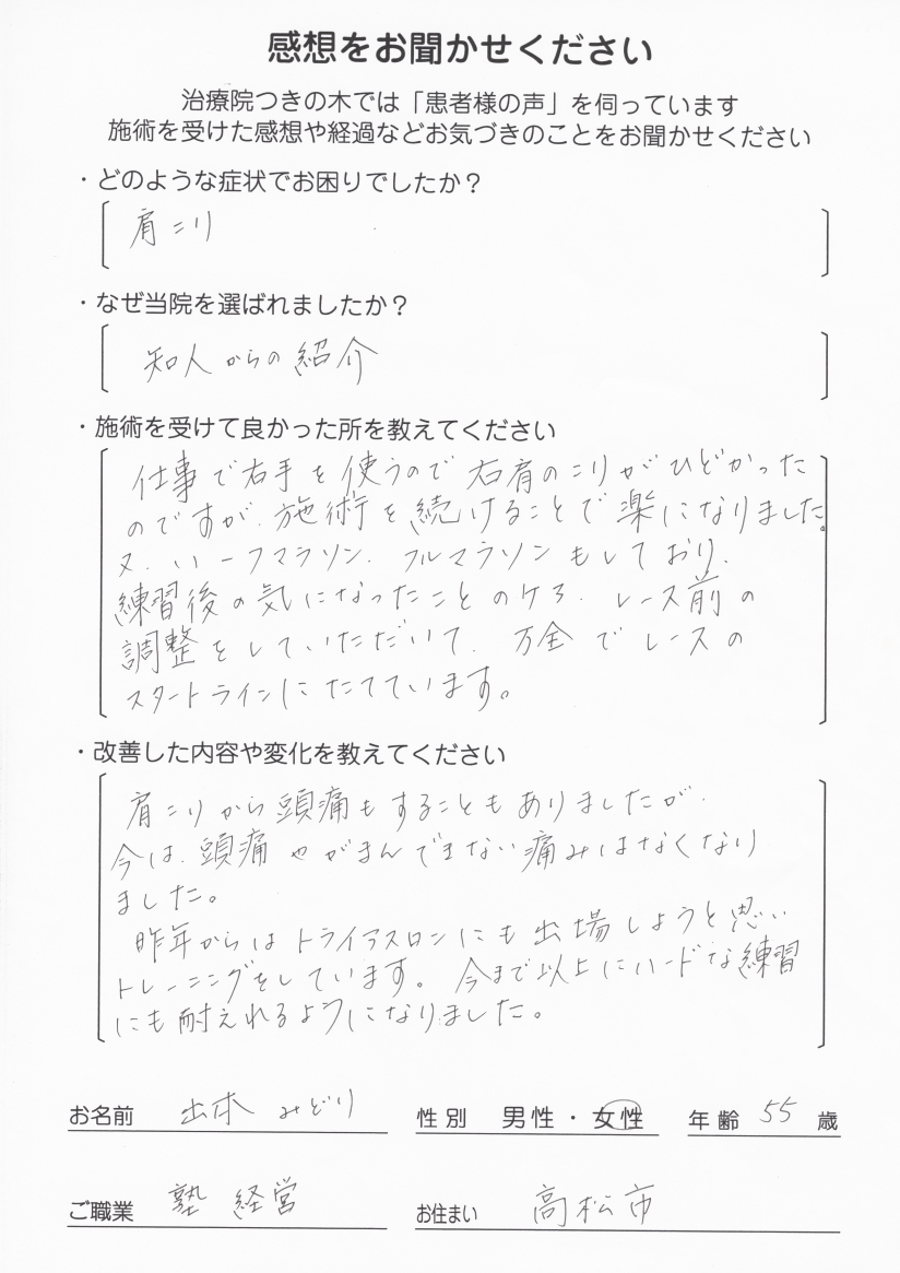 ■肩こり、マラソンにおけるパフォーマンスアップ 55歳女性